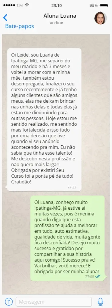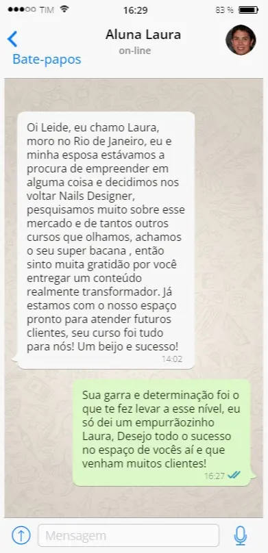 Nunca tive condições boas, não sou de família rica, más sempre almejei crescer e obter o meu sucesso profissional, foi quando vi um anúncio de um curso online de Alongamento de Unhas, assim como você está descobrindo esta oportunidade através do meu curso, eu também comecei assim, investindo em estudo, juntei toda a grana que tinha e fechei os meus olhos e comprei o tal curso.